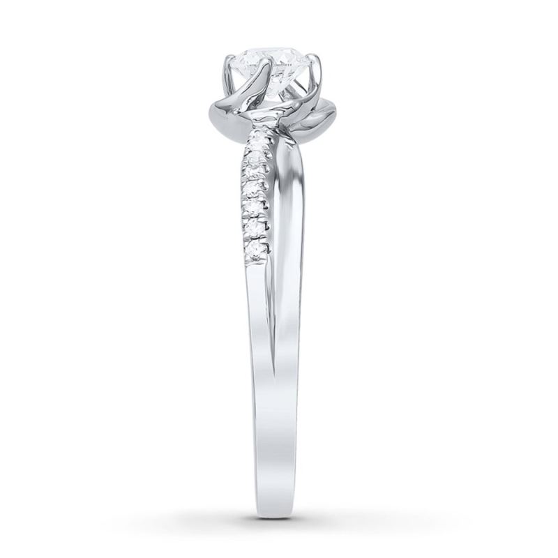 A round diamond sits in petals of 10K white gold as the floral centerpiece of this romantic engagement ring for her. More round diamonds shimmer along the band to complement. The ring has a total diamond weight of 1/3 carat.