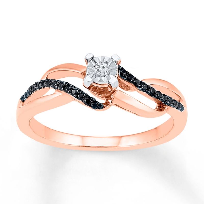 A white diamond is the heavenly centerpiece of this pretty promise ring for her. Ribbons of 10K rose gold lined with black diamonds swirl around the centerpiece to complete the look. The ring has a total diamond weight of 1/6 carat. Black diamonds are treated to permanently create the intense black color.