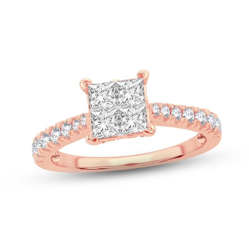 This romantic engagement ring for her features a quartet of brilliant princess-cut diamonds. Radiant round diamonds sparkle down the 14K rose gold band for a total diamond weight of 1 1/4 carats. From the Now and Forever® bridal collection.