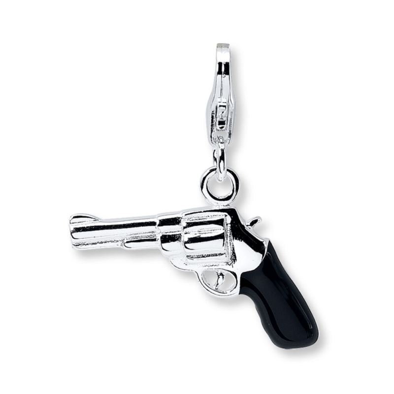 Hit a bullseye with this 3D pistol charm. Crafted in sterling silver, the charm features black enamel detailing and fastens with a lobster clasp.