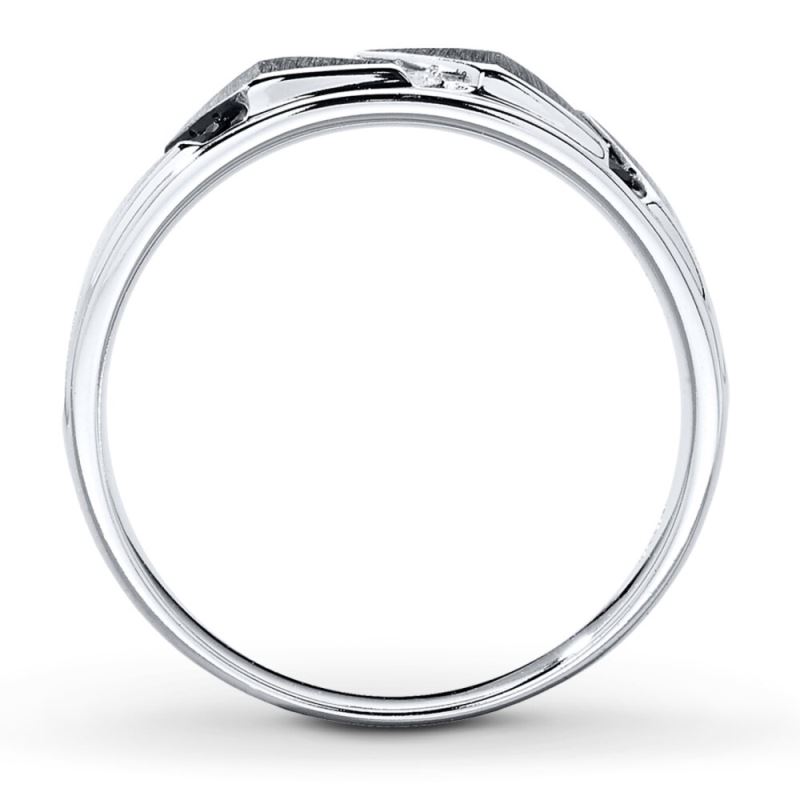 Diagonal trios of white and black diamonds are channel-set into this appealing men's wedding band. The 10K white gold ring has a brushed finish and a total diamond weight of 1/5 carat. Black diamonds are treated to permanently create the intense black color. Available online while supplies last. Previously Owned Treasures are not eligible for in-store pick-up. Previously Owned Treasures may only be shipped either to your home address or to an alternate address.