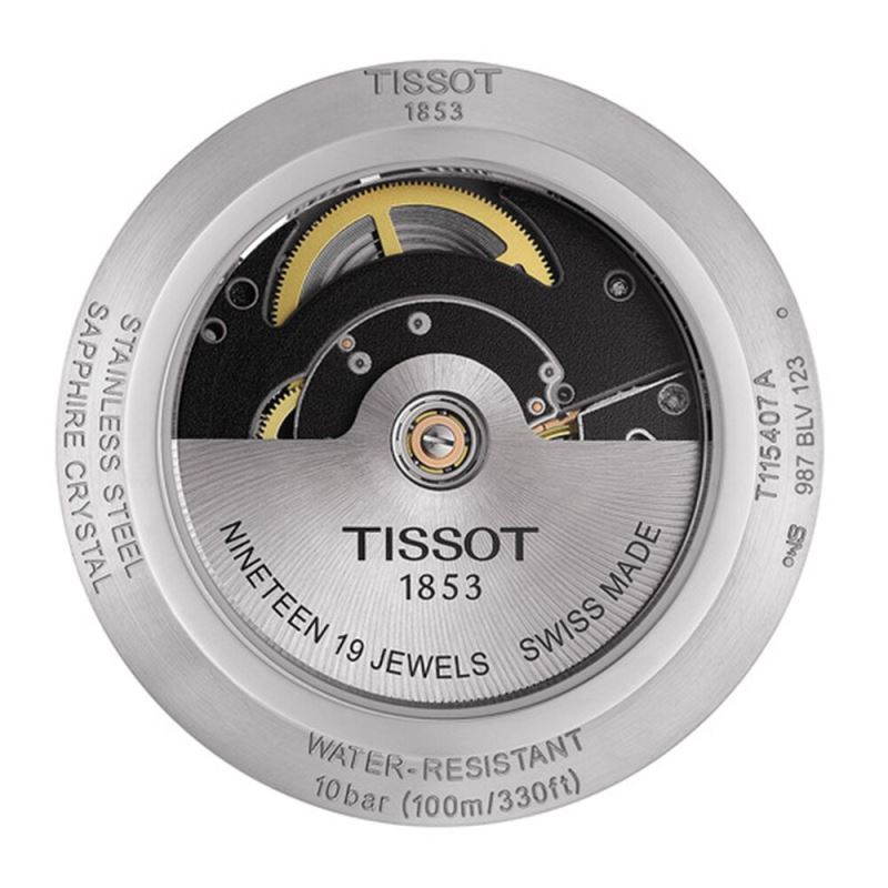 This Tissot T-Race underlines the spirit of motosports while for the first time integrating a Swissmatic movement. The 49mm stainless steel case with blue dial is inspired by the frame and parts of motorbikes, with features including the iconic brake-disc bezel, see-through case back and water resistance to 100 meters. The blue leather strap is secured with a standard buckle clasp. Style # T1154071704100.