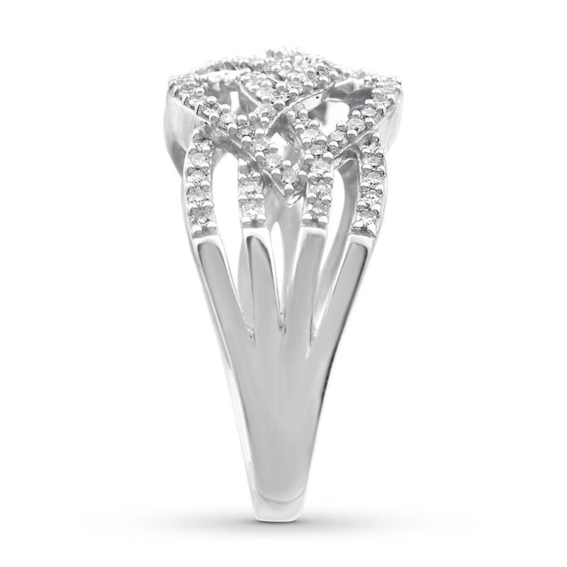 Woven ribbons of round diamonds set in 10K white gold form this sparkling ring for her. The diamonds total 1/3 carat in weight.