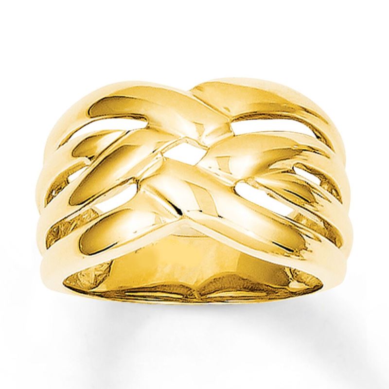 Four swirls of 14K yellow gold cross over and under through the center to form this stylish dome ring for her.